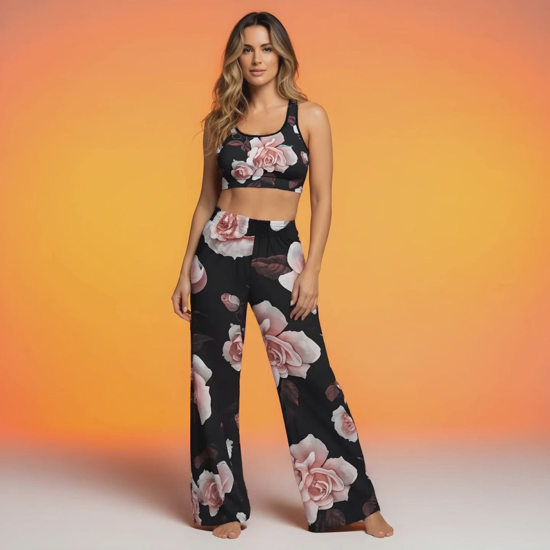 A BunnyBankY AI proprietary model wearing The Paris Flow Wide Joggers and Bristol Performance Tank. The image showcases the fluid, smooth floral print and the supportive fit, illustrating the brand's fusion of AI innovation and natural abstract design.